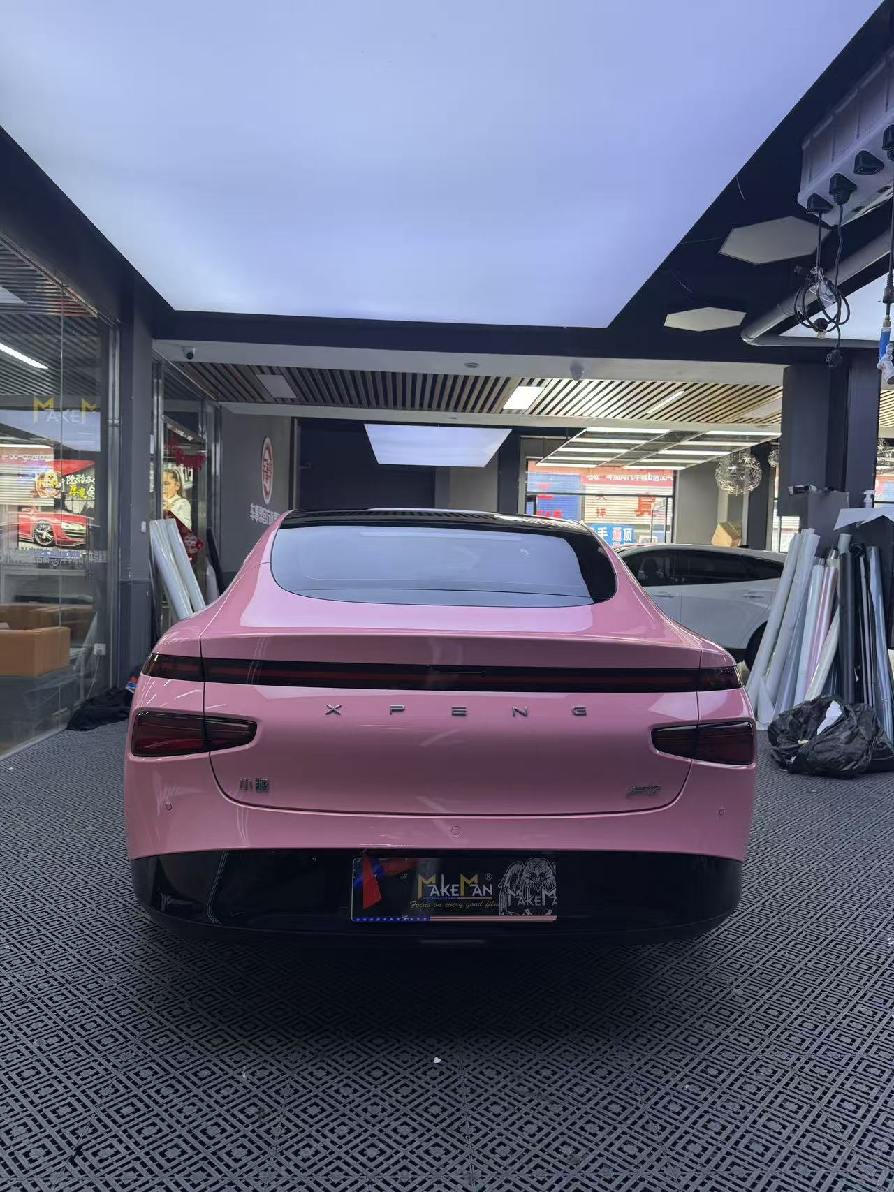 ▫️ 选了嫩乎乎的樱花粉 + 纯净白双拼,粉色像融化的草莓奶昔,阳光下透亮得能反光,和小鹏的科技感车身意外适配;